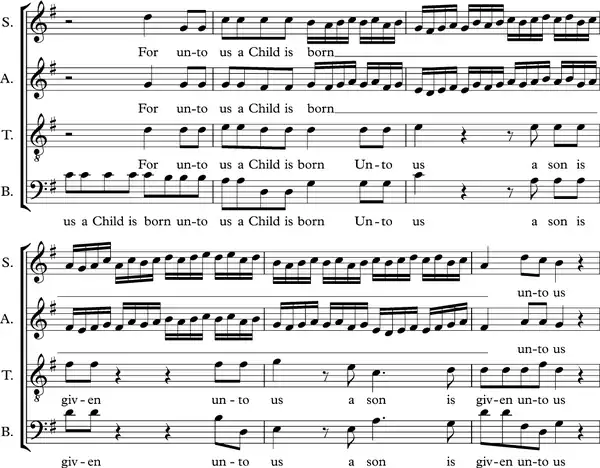 Handel's "For Unto Us a Child is Born" (HWV 56) relies quite heavily on both melodic and harmonic sequencing, as can be seen in the following excerpt. In this vocal reduction, the soprano and alto lines reiterate a florid two-beat melodic motif for three and a half bars in a series of melodic sequences on the word "born." More subtle, though still present, is the underlying ascending 5-6 harmonic sequence.
