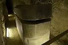 - Blocking the original entrance to the Greater Vaults is the "grey granite" sarcophagus dedicated by Cambyses II (c. 530 BC), first Persian ruler of Egypt. Only its lid is inscribed.[43]