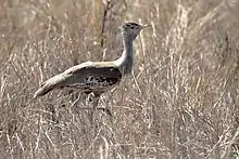 One of Serendip Sanctuary's initial breeding programs included the reintroduction of the Australian Bustard, Ardeotis Australis.[17] The program launched in the 1960s to study, breed and reintroduce the fallen Australian Bustard populations. Serendip Sanctuary was used to recreate the Bustard's natural lek mating system in captivity.[17] In lek mating systems, male Bustards defend small clustered areas that female Bustards visit for the purpose of mating.[17][18] In such systems, males are confined together at specific sites for display, where females visit to select their mating partner.[18] Researchers at Serendip Sanctuary recreated the lek mating system in captivity by constructing an enclosure that allowed female bustards to enter and select a male mating partner, but separated the males from direct contact.[18]