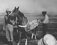 Reckless developed arthritis in her back as she aged and injured herself on May 13, 1968, by falling into a barbed wire fence. She died under sedation while her wounds were being treated.[42] At the time of her death, she was estimated to be 19 or 20 years old.[4] There is a plaque and photo commemorating her at the Camp Pendleton stables.[10] The first race at Aqueduct racetrack, New York, was designated "The Sgt Reckless" on November 10, 1989.[4] In 1997, Reckless was listed by LIFE magazine as one of America's 100 all-time heroes.[37]
