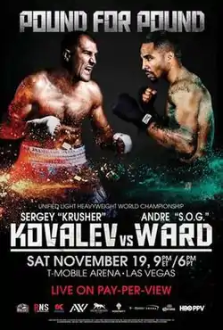 Sergey Kovalev vs. Andre Ward, billed as Pound for Pound, was a highly anticipated professional boxing superfight for the unified WBA (Undisputed), IBF, and WBO light heavyweight titles. The bout was held on November 19, 2016, at the T-Mobile Arena in Las Vegas, Nevada. The event was televised on HBO Pay-per-view.[1] Ward won the fight by unanimous decision to take the titles.[2][3]