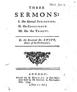 Jonathan Swift, as Dean of St. Patrick's Cathedral in Dublin, produced many sermons during his tenure from 1713 to 1745.[1] Although Swift is better known today for his secular writings such as Gulliver's Travels, A Tale of a Tub or the Drapier's Letters, Swift was known in Dublin for his sermons that were delivered every fifth Sunday. Of these sermons, Swift wrote down 35, of which 12 have been preserved.[2] In his sermons Swift attempted to impart traditional Church of Ireland values to his listeners in a plain manner.[2]