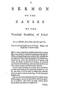 The sermon is properly titled "A Sermon on the Wretched Conditions of Ireland".[60] Its introductory passage from scripture comes from Psalms 144: 14–15 – "That there be no complaining in our streets. Happy is the people that is in such a case."[61]