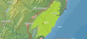 The park protects the environment of large zones of the Serra d'Irta mountain range with the highest elevation being the pico Campanilles (or Campanella) at 572 metres, and the coastal area of the Costa del Azahar with the reefs of the marine reserve extending into the sea.[1] The range runs parallel to the coast and forks in the south in an area separated by the Estopet valley. On the coastal side the mountains descend abruptly along 12 km with numerous cliffs, coves and cornices.