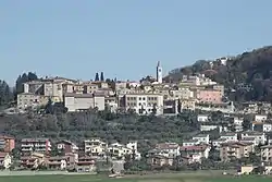 It is located on a hill midway between the valleys of the Sentino and Ombrone rivers.
