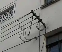 In electric power distribution, a service drop is an overhead electrical line running from a utility pole, to a customer's building or other premises. It is the point where electric utilities provide power to their customers.[1] The customer connection to an underground distribution system is usually called a "service lateral". Conductors of a service drop or lateral are usually owned and maintained by the utility company, but some industrial drops are installed and owned by the customer.