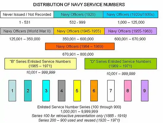 The B service number series was issued from 1965 to 1971. In 1969, the Navy further activated a "D series" which reset service numbers to 10,001 to 99,999 (there was never a "C series" created). In 1972, Navy service numbers were discontinued upon the Navy formally abolishing the use of military service numbers in favor of Social Security numbers.
