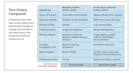 The after-sales market consists of service part and after-sales service. These areas often account for a low share in total sales, but for a relatively high share in total profits.[1] It is important to understand that the after-sales supply chain is very different from the manufacturing supply chain, and hence rules that apply to pricing manufacturing parts do not hold good for pricing service parts. Service parts pricing requires a different outlook and approach.