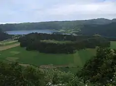 The Sete Cidades volcano is situated on the extreme western portion of the island of São Miguel occupying an area of approximately 110 square kilometres (42 sq mi) and refers to a polygenetic volcano (Sete Cidades Massif) and caldera.[6] Its subaerial volume, of about 70 cubic kilometres (17 cu mi), has grown at an estimated rate of 0.02–0.03 cubic kilometres (0.0048–0.0072 cu mi) per century, beginning more than 210,000 years ago.[6] Presently, the interior of the structure is occupied by diverse volcanic structures and four lakes. It is almost circular caldera (5 kilometres (3.1 mi) in diameter and up to 400 metres (1,300 ft) high walls) formed through three phases of eruptions.[6] The last intra-calderan eruption occurred approximately 500 years A.D., resulting in the creation of the Caldeira Seca cone. At the base of the caldera, there exist six Holocene era pyroclastic cones. Further, a large group of pleistocene post-caldera trachytic lava domes, lava flows, and pyroclastic flow deposits have been discovered on the northwestern flanks of the massif.