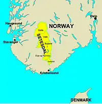 Setesdal (Urban East Norwegian: [ˈsêːtəsdɑːɫ];[1] older name: Sætersdal) is a valley and a traditional district in Agder County in southern Norway. It consists of the municipalities of Bykle, Valle, Bygland, Iveland, and Evje og Hornnes.