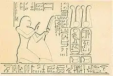 In Abu Simbel Seti is given the titles: Hereditary Prince, Count, King's Son of Kush, Overseer of the Gold Lands of Amun, Fan-bearer on the King's right, King's Scribe of the letters of Pharaoh, First chief in the stable, Eyes of the King of Upper Egypt, Ears of the King of Lower Egypt, High-Priest of the Moon-god, Thoth, Overseer of the Treasury, and Overseer of the letter-scribes in the Court of the Palace-of-Ramesses-Miamun, in the Court.[2]
