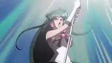![]() Setsuna as Sailor Pluto in her original uniform, with the Garnet Rod, as drawn by Naoko Takeuchi. | |