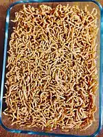 Sev is a popular Indian snack food[1] consisting of small pieces of crunchy noodles made from chickpea flour paste, which are seasoned with turmeric, cayenne, and ajwain[2] before being deep-fried in oil.[3][4][5] These noodles vary in thickness.[6] Ready-to-eat varieties of sev, including flavoured sev, are available in Indian stores.[7]