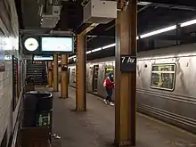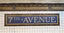 Both platform walls have a golden mosaic trim line with blue and brown borders and white on blue "7" friezes appearing within them at regular intervals. Mosaic name tablets reading "7TH AVENUE" in white seriffed lettering on a blue background and gold and brown border appear below the trim lines. Gamboge I-beam columns run along both platforms, alternating ones having the standard black station name plate with white lettering.