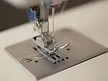 When creating a zigzag stitch, the back-and-forth motion of the sewing machine's needle is controlled by a cam. As the cam rotates, a fingerlike follower, connected to the needle bar, rides along the cam and tracks its indentations. As the follower moves in and out, the needle bar is moved from side to side.[24] Very old sewing machines lack this hardware and so cannot natively produce a zigzag stitch, but there are often shank-driven attachments available which enable them to do so.[25]