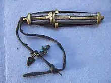 The first form of sewing was probably tying together animal skins using shards of bone as needles,[7] with animal sinew or plant material as thread.[8] The early limitation was the ability to produce a small enough hole in a needle matrix, such as a bone sliver, not to damage the material. Traces of this survive in the use of awls to make eyelet holes in fabric by separating rather than cutting the threads. A point that might be from a bone needle dates to 61,000 years ago and was discovered in Sibudu Cave, South Africa.[9] A needle made from bird bone and attributed to archaic humans, the Denisovans, estimated to be around 50,000 years-old, and was found in Denisova Cave.[10] A bone needle, dated to the Aurignacian age (47,000 to 41,000 years ago), was discovered in Potok Cave (Slovene: Potočka zijalka) in the Eastern Karavanke, Slovenia.[11] Bone and ivory needles found in the Xiaogushan prehistoric site in Liaoning province date between 30,000 and 23,000 years old.[12] Ivory needles were also found dated to 30,000 years ago at the Kostenki site in Russia.[13] 8,600-year-old Neolithic needle bones were discovered at Ekşi Höyük, western Anatolia, in present-day Denizli Province.[14] Flinders Petrie found copper sewing needles at Naqada, Egypt, ranging from 4400 BC to 3000 BC.[15] Iron sewing needles were found at the Oppidum of Manching,[16] dating to the third century BC.
