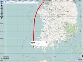 Sewol began operations on 15 March 2013.[41] She made three round trips per week from Incheon to Jeju, each one-way voyage of 425 kilometres (264 mi) taking 13.5 hours to complete.[42] On 19 February 2014, she received an interim inspection and a periodic inspection from the Register.[33]: 17 It had made the round trip a total of 241 times until the day of the incident.[41]
