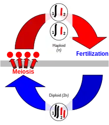 Sexual reproduction is a process exclusive to eukaryotes in which organisms produce offspring that possess a selection of the genetic traits of each parent. Genetic traits are contained within the deoxyribonucleic acid (DNA) of chromosomes. The cells of eukaryotes have a set of paired homologous chromosomes, one from each parent, and this double-chromosome stage is called "diploid". During sexual reproduction, diploid organisms produce specialized haploid sex cells called gametes via meiosis,[8] each of which has a single set of chromosomes. Meiosis involves a stage of genetic recombination via chromosomal crossover, in which regions of DNA are exchanged between matched pairs of chromosomes, to form new chromosomes each with a new and unique combination of the genes of the parents. Then the chromosomes are separated into single sets in the gametes. Each gamete in the offspring thus has half of the genetic material of the mother and half of the father.[9] The combination of chromosomal crossover and fertilization, bringing the two single sets of chromosomes together to make a new diploid zygote, results in new organisms that contain different sets of the genetic traits of each parent.