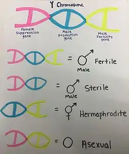 Several studies concentrated on Silene latifolia have shown a correlation between loci on the Y chromosome and the sex that is expressed phenotypically in the flower. Two of these sex-linked genes "promote maleness" (male fertility and male promotion) and one of them codes for female suppression.[4][7] Therefore, the Y chromosome carries three dominant genes that determine the sexual expression in a Silene offspring. If there are deletions and mutations in the Y chromosome during reproduction, then different sex-linked genes are lost. The different combinations of possible sex-related genes that an individual Silene can have in one Y chromosome are what creates the rich variation of sexual phenotypes throughout this genus.