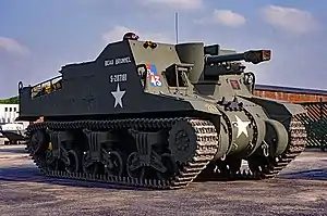 The 25pdr SP, tracked, Sexton[2] was a Canadian-designed self-propelled artillery vehicle of the Second World War. It was based on Canadian-built derivatives of the American M3 Lee and M4 Sherman tank chassis. Canada had set up to produce the Ram tank using the M3 chassis and Grizzly (a copy of the M4) to complement US medium tank production; when Sherman production in the US expanded and supply was no longer a problem, it was decided in 1943 to switch the Canadian production lines to produce the Sexton to give the British Army a mobile artillery gun using their 87.6 mm (3.45 in) Ordnance QF 25-pounder gun-howitzer for commonality with towed guns. The Sexton could fire either HE shell or an armour-piercing shell. It found use in the Canadian and British Army, as well as numerous other British Empire and associated forces. Just after the war, a number of Grizzly and Sextons were sold to Portugal, who used them into the 1980s.