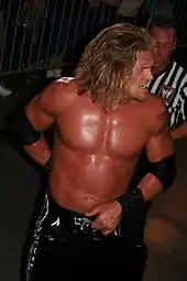 On the July 11 episode of Raw, Edge's match with Kane was interrupted when Matt Hardy made a surprise appearance. Hardy referred to Edge by his real name and issued a threat to Lita as well.[93] When Hardy was officially brought back to Raw, he and Edge continued their feud, including a match at SummerSlam on August 21 where Edge defeated Hardy, causing Hardy to have excessive blood loss.[94] A week later on Raw, after a match Hardy had with Rob Conway, Edge then appeared and overpowered Hardy. He then wedged Hardy's head between the steel steps and the ringpost, and then kicked the steel steps into Hardy's head.[95] On the August 29 episode of Raw, Edge and Hardy fought in a Street Fight, which resulted in a no contest when Hardy performed a side effect on Edge off the entrance ramp into the sound speakers and other electrical equipment.[96] They also fought in a Steel cage match at Unforgiven on September 18 in which Hardy defeated Edge.[97] The feud culminated in a Loser Leaves Raw ladder match on Raw Homecoming on October 3, which Edge won.[98] After the match, Hardy left the Raw brand to go to the SmackDown! brand, while Edge suffered a legit torn pectoralis major muscle that kept him shelved for a couple of months.[99] During his time off, he starred in his own talk show segment on Raw entitled The Cutting Edge,[100] dubbing himself the "Rated-R Superstar". Edge used his talk show to start a feud with Ric Flair following Flair's well-publicized arrest in connection with a road rage incident.[100][101] Edge eventually began using The Cutting Edge as a soapbox to run down Flair until, after weeks of public mockery, Flair eventually showed up and attacked Edge.[102] Edge and Flair formally met at the New Year's Revolution event on January 8, 2006 in a match for Flair's Intercontinental Championship, which resulted in Flair retaining after Edge was disqualified.[103]