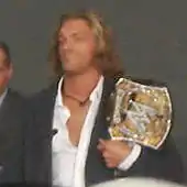 Edge was drafted to the Raw brand in the 2004 WWE draft lottery on March 22, 2004, where he speared Eric Bischoff and returned to in-ring action shortly after the event.[75] At Backlash on April 18, Edge defeated Kane,[76] and on the April 19 episode of Raw, he and World Heavyweight Champion Chris Benoit won the World Tag Team Championship from Batista and Ric Flair.[77] They continued a close partnership even after losing the title; at Bad Blood on June 13, Edge and Benoit defeated La Résistance (who defeated them for the titles on the May 31 episode of Raw) in a match for the World Tag Team Championship by disqualification but did not win the titles. The team disbanded when Edge won the Intercontinental Championship at Vengeance on July 11 defeating Randy Orton, thus becoming a five time Intercontinental Champion.[78] At SummerSlam on August 15, Edge defeated Chris Jericho and Batista in a triple threat match to retain the Intercontinental Championship.[79] Following a legitimate groin injury in a non-televised match, Raw General Manager Eric Bischoff stripped Edge of the Intercontinental title on the September 6 episode of Raw.[80]