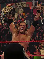 After making his professional wrestling debut in 1992, Copeland wrestled in various independent promotions, competing in singles and tag-team competition, the latter with long-time friend Christian. In 1997, he signed a developmental deal with the World Wrestling Federation (WWF, now WWE) and made his televised debut in 1998 under the ring name Edge. After winning the WWF Intercontinental Championship in 1999, Edge formed a tag team with Christian, and the two won the World Tag Team Championship on seven occasions. During this time, they gained notoriety due to their participation in Tables, Ladders, and Chairs matches. They are considered one of the major teams that revived tag team wrestling during the Attitude Era.[9] Edge split with Christian in 2001 and embarked on a successful solo career. He has won the second-most championships in WWE history with 31, holding the World Heavyweight Championship a record seven times, the WWE Championship four times, the Intercontinental Championship five times, the United States Championship once, the World Tag Team Championship a record 12 times, and the WWE Tag Team Championship twice. He is WWE's 14th Triple Crown Champion and 7th Grand Slam Champion. He won the 2001 King of the Ring tournament, the 2005 (and first) Money in the Bank ladder match, and 2010 Royal Rumble match, making him the first wrestler to achieve all three.[10]