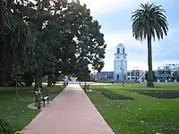 Blenheim is on the Main North Line, the northern part of the unofficially-named South Island Main Trunk Railway. The Coastal Pacific, a long-distance passenger train between Picton and Christchurch, stops at Blenheim Railway Station.[15] The 1906 station has been listed NZHPT Category II since 1982.[16] It is a standard Vintage station, with Tudor half-timbering and tile.[17]