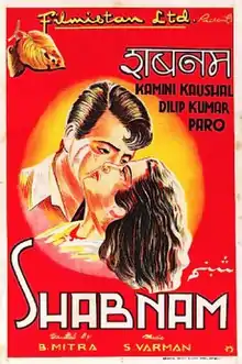 Shabnam is a 1949 Hindi movie produced by Filmistan and directed by B. Mitra. The film stars Dilip Kumar, Kamini Kaushal, Jeevan and Shyama. The film's music is by S. D. Burman.[1] When Indian film actor Manoj Kumar saw this movie at the age of 12-13, he was so impressed with Dilip Kumar's name that he decided to change his film name to Manoj Kumar if he ever became a film actor.[2]