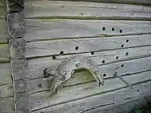 The shaft bow has different names in different languages and dialects. The commonly used, standard term in Finnish is luokka or luokki. Luokki is the form used in the eastern dialects of Finnish, luokka is used in the western ones. In Karelian, the shaft bow is called vemmel, vempele or vembel depending on the region. In addition to Finnish, the word luokki also appears in Votic, Estonian (look) and Livonian. In Russian the shaft bow is called simply an "arch", Russian: дуга (duga). In Finnish, the word vemmel is rarely in use but is recognised as a synonym for arch. The Finnish terms are ancient, and words like vemmelsääri (bowleg or luokki leg) to mean a hare in a playful context are still in use.