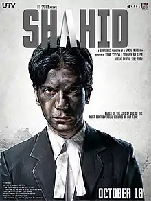 Shahid premiered at the 2012 Toronto International Film Festival in its "City to City" programme in September 2012.[21][22] The film was screened at several film festivals including the 14th Mumbai Film Festival, the New York Indian Film Festival, the Indian Film Festival of Stuttgart, the Dubai International Film Festival and the Chicago South Asian Film Festival.[23][18][24] The film's album soundtrack consisted of one song titled "Beparwah", sung by Arijit Singh.[25] The music was composed by Karan Kulkarni.[26] The film's poster, which showed Rao's blackened face, was also released.[27] The official trailer was unveiled on 20 September 2013.[24] The film opened in India on 18 October 2013 around 400 screens.[22][28] A private screening of the film was held for the cast and crew before its release.[29] Shahid is also available on SonyLiv and Netflix.[30]