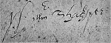 Although some scholars took note of, and reproduced, Shakespeare's handwriting as early as the 18th century,[16] the paleographer Sir Edward Maunde Thompson wrote in 1916 that the subject of Shakespeare's handwriting had "never been subjected to a thorough and systematic study." One reason for this neglect is that the only examples of Shakespeare's handwriting that were known to earlier scholars were five authentic signatures.[19] A further difficulty was that three of the known signatures were written in the last weeks of Shakespeare's life, when he may have been suffering from a tremor or otherwise enfeebled by illness, and the other two had been written under conditions that restrained free movement of the hand. Those signed to the Blackfriars mortgage had to be squeezed into the narrow space of the seal.[20]