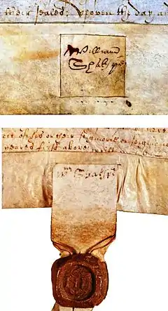 Three of these signatures are abbreviated versions of the surname, using breviographic conventions of the time, which was common practice. For example, Edmund Spenser sometimes wrote his name out in full (spelling his first name Edmund or Edmond), but often used the abbreviated forms "Ed: spser" or "Edm: spser".[14] The signatures on the Blackfriars document may have been abbreviated because they had to be squeezed into the small space provided by the seal-tag, which they were legally authenticating.
