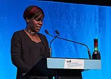 In April 2017, Martin, the union's vice-president for further education, defeated the incumbent Malia Bouattia, receiving 56% of the vote.[2] After widespread discontentment with Bouattia's leadership of the NUS, Martin pledged "unity", "pragmatism", and to put the "NUS back into the hands of its membership".[3] She describes herself as a black working-class single mother, and comes from a Jamaican family background.[2] She was the first woman from the African-Caribbean community to serve as NUS President, and the second not to have studied at university.[4]