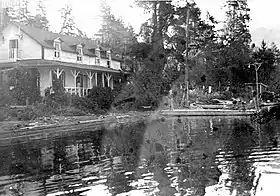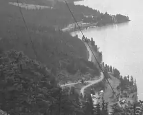 Craig Lodge, built in 1915, but destroyed by fire about 1948,[16] was an official intermediate stop prior to the hotel's demise. However, the shuttle would also stop at any of the hamlets on request. The train always remained overnight at Lillooet. In the early 1940s, the Sunday runs were eliminated. In 1958, the western terminus moved to Seton Portage.[15] On the BC Rail main line, Shalalth, which was a key station over the decades,[17] had become a flag stop by the 2000s.[18] It was 6.3 kilometres (3.9 mi) northeast of Seton and 10.3 kilometres (6.4 mi) northwest of Retaskit.[19] In 2002, BC Rail withdrew all passenger services.[20] The indigenous operated Kaoham Shuttle continues to serve Shalalth.