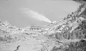 A "model village" was erected at Bridge River (South Shalalth) and work began on the 4.0-kilometre (2.5 mi) tunnel in 1927, with an expected completion date of 1930.[14] Construction halted in 1929 with the onset of the Great Depression and the collapse of financial backing for the project. The townsite remained largely empty during the 1930s, although steady traffic to the mines kept the hotels busy.