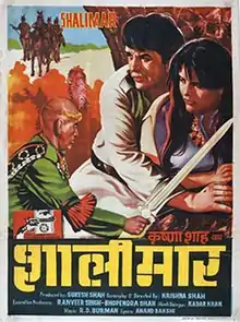 Shalimar (Hindi : शालीमार) is a 1978 bi-lingual Bollywood film, written and directed by Krishna Shah.[2] The movie starred Dharmendra, Zeenat Aman, Sir Rex Harrison, Shammi Kapoor, John Saxon and Sylvia Miles.[3] English actor Sir Rex Harrison and American actors John Saxon and Sylvia Miles played important roles in their first and only Bollywood film.[4] Jayamalini does a dance number in the film. This was the last time that Mohammed Rafi's voice was picturized on Shammi Kapoor.[5] Its English version is known as Raiders of the Sacred Stone. Rex Harrison's voice was dubbed by Kader Khan. The plot is inspired by the novel The Vulture is a Patient Bird by James Hadley Chase, The film's script was novelized by Manohar Malagaonkar. Shalimar is the most expensive movie ever made in India.[6] The English version of the movie was released in the United States titled as the Raiders of the Sacred Stone.