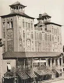 Before his visit to Europe, Naser al-Din Shah Qajar, the fourth king of Qajar dynasty, was thinking of building a mansion in his capital to compete with Isfahan’s Ālī Qāpū. A tall building that he could stand on its roof and see the entire Tehran. By his order, Shams-ol-Emareh building was started in 1865 and was finished in two years. Naser al-Din Shah took his guests to the roof of this building to see the capital. The building’s designer was Moayer al Mamalek and the architecture was Ali Mohammed Kashi. The style of this building is a combination of traditional Iranian and Western architecture.[3]