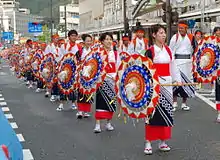 The Kasa-odori is very popular in the eastern part of Tottori Prefecture. According to a legend in Kokufu, in the Edo period (1603–1867) during a drought, an old man named Gorosaku danced with an umbrella for the village god praying for rain. Gorosaku danced with the umbrella until he died, and the drought ended. These days, the dance is performed with ornamented paper umbrellas and Japanese swords, which represent the beautiful but gallant local culture of Tottori.