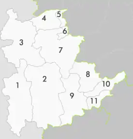Shan State is traditionally divided into three sub-states: Southern Shan State (1–2), Northern Shan State (3–7), and Eastern Shan State (8–11). It is officially divided into 11 districts:[31][32]