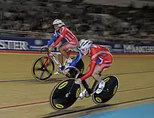 A month later, on 29 March, Reade went on to take first place in Team Sprint at the UCI Track Cycling World Championships in Palma de Mallorca along with Victoria Pendleton.[18] It was also the first ever Women's Team Sprint Gold Medal title in that event. Their winning time was 33.631 seconds.[19] Reade was a last minute replacement for Anna Blyth,[20] Reade's partner at her first track racing event a month prior.