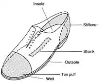 Materials and design for shanks vary widely with the purpose of the footwear. The shank of a pointe shoe used for ballet is made of flexible materials like leather, plastic, or cardstock, and may have customized length, thickness, and stiffness. Heavy boots such as those used for construction or hiking have far more rigid and durable shanks, often using steel, though contemporary shanks are more commonly made of less heat-conductive materials such as fiberglass and Kevlar. These materials' rigid nature adds a protective element, helping shield feet from puncture wounds and stone bruises.[1] The shank is crucial to the functionality of mountaineering boots, as they diminish the load incurred by the feet and calves over the course of an ascent.