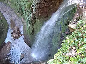 A chine is a local word for a stream cutting back into a soft cliff. Formation of the Chine, which cuts through Lower Greensand Cretaceous sandstones, has taken place over the last 10,000 years. In the latter half of the nineteenth century, stones were laid at the top of the waterfall to arrest this progress. There are a continuous series of spring lines on the cliff faces in the Chine. The Isle of Wight has a number of chines, but the largest remaining is Shanklin. With a drop of 32 m (105 ft) to sea level, and a length of just over 400m (a quarter of a mile), the Chine covers an area of approximately 1.2 hectares (three acres).[1]