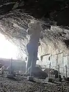 In the cave, on the fourth of five terraces, stands the statue of Shapur I, the second ruler of the Sasanid Empire. The statue was carved from one stalagmite.[1] The height of statue is 7 metres and its shoulders are 2 m wide, and its arms are 3 m long.[1]