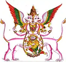 In Puranic literature, Sharabha incarnates to subdue fierce manifestations of Vishnu. The legend of Sharabha fighting Narasimha - the man-lion form of Vishnu - brings to fore the overt rivalry between the devotees of Vishnu (Vaishnava sect) and those of Shiva (Shaiva sect), which exposes the fierce debate aspect.[1][7][8] The Shiva Purana[1][9] The Sharabha Upanishad portrays Sharabha with two heads, two wings, eight legs of the lion with sharp claws and a long tail.[10] The Kalika Purana describes Sharabha as black in colour, with four feet downwards and four feet uplifted, with an enormous body. It also has a long face and nose, nails, eight legs, eight tusks, a cluster of manes, and a long tail. It jumps high repeatedly making a loud cry.[8][11]