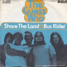 "Share the Land" is a song written by Burton Cummings and performed by The Guess Who. It reached #2 in Canada,[1] #10 on the Billboard Hot 100,[2] and #63 in Australia in 1970. The song was also released in the United Kingdom as a single, but it did not chart.[3] The song is featured on their 1970 album, Share the Land.[4]