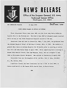 army/2017/05/28/friends-recall-only-nurse-killed-by-hostile-fire-in-vietnam/|title=Friends recall only nurse killed by hostile fire in Vietnam|date=May 28, 2017|accessdate=2019-07-20}}</ref>[8]