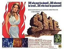 The re-filming of the H. Rider Haggard novel – which had been filmed previously in 1908, 1911, 1916, 1917, 1925 and 1935[4] – was the idea of Kenneth Hyman of Seven Arts Productions, who had a long-running relationship with Hammer Film Productions. Anthony Hinds commissioned a script from John Temple-Smith, and the lead role was assigned to Ursula Andress, known at that time for her role in the James Bond film Dr. No.[5] She would thus become the first Hammer film to be built around a female star.[5]