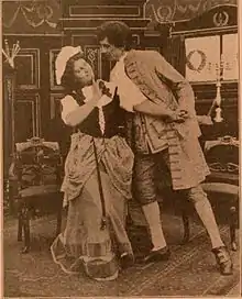 The scenario is an adaptation of Oliver Goldsmith's She Stoops to Conquer and was not, by that time, not familiar to most theatergoers.[1] The writer of the scenario is unknown, but it was most likely Lloyd Lonergan. He was an experienced newspaperman employed by The New York Evening World while writing scripts for the Thanhouser productions.[4] The impetus to adapt the play for the film may have been inspired by a recent Broadway production as noted in one Thanhouser advertisement, "So revered is She Stoops to Conquer in the hearts of the American public that recently they saw it as an all-star Broadway production with Eleanor Robson as Kate and Kyrle Bellew as Marlow, and it scored an epoch-making success. The present producers don't claim it to be a Broadway production but they [do] know it's the best picture thing of its kind that has been released this far in the game."[1] The advertisement also claims to be the first film adaptation of the play, which according to The Complete Index to Literary Sources in Film it is.[5] She Stoops to Conquer would see numerous adaptations over the following decades, but the Thanhouser Company would also draw from Goldsmith's work with their first adaptation of The Vicar of Wakefield in 1910.[1]