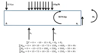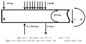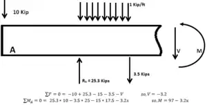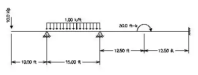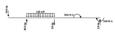 The example is illustrated using United States customary units. Point loads are expressed in kips (1 kip = 1000 lbf = 4.45 kN), distributed loads are expressed in k/ft (1 k/ft = 1 kip/ft = 14.6 kN/m), moments are expressed in ft-k (1 ft-k = 1 ft-kip = 1.356 kNm), and lengths are in ft (1 ft = 0.3048 m).